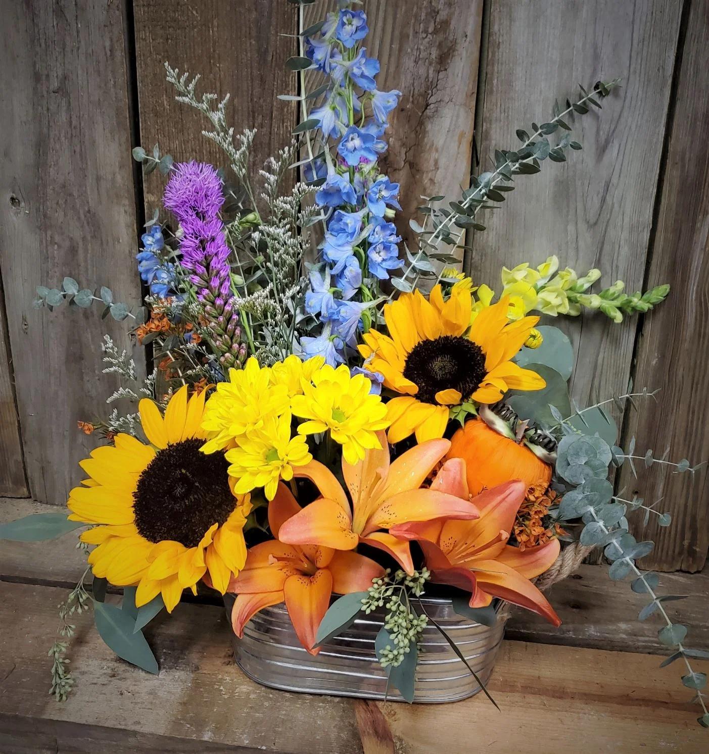 - Summer fall mix of flowers in a basket